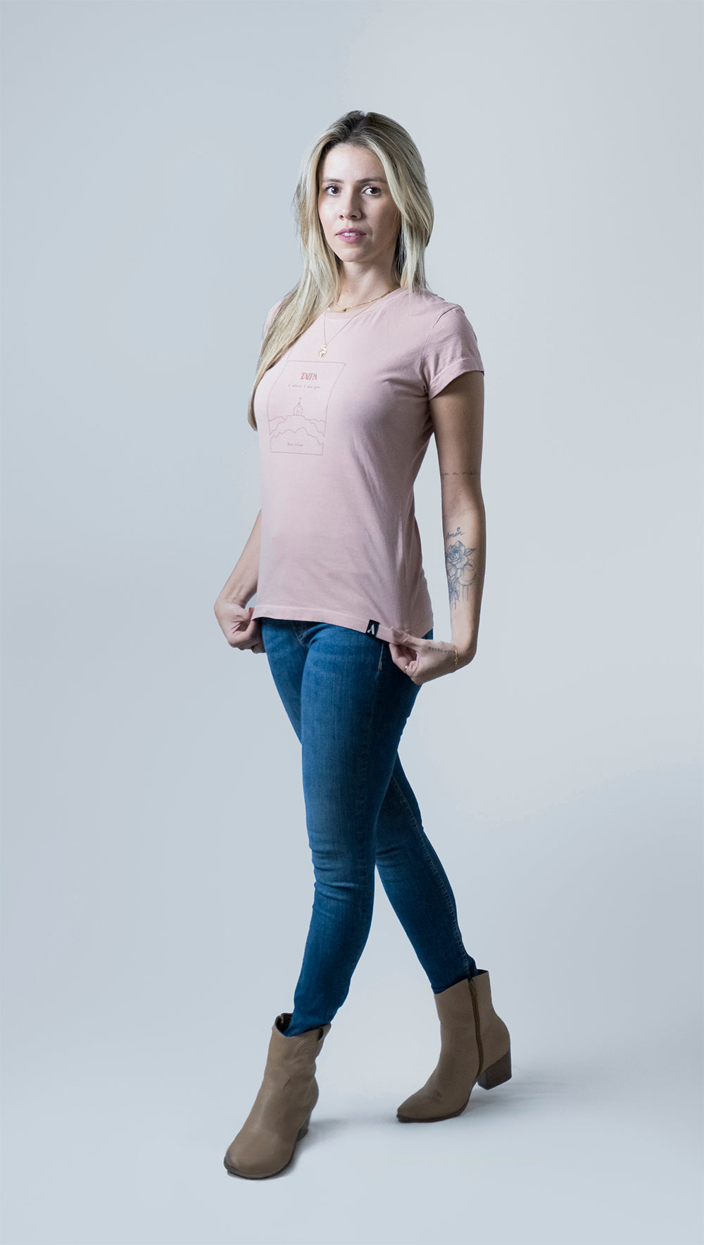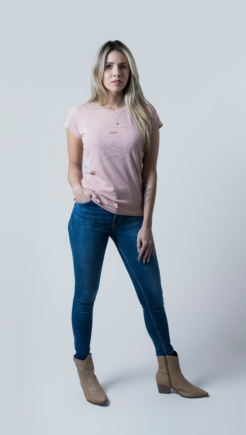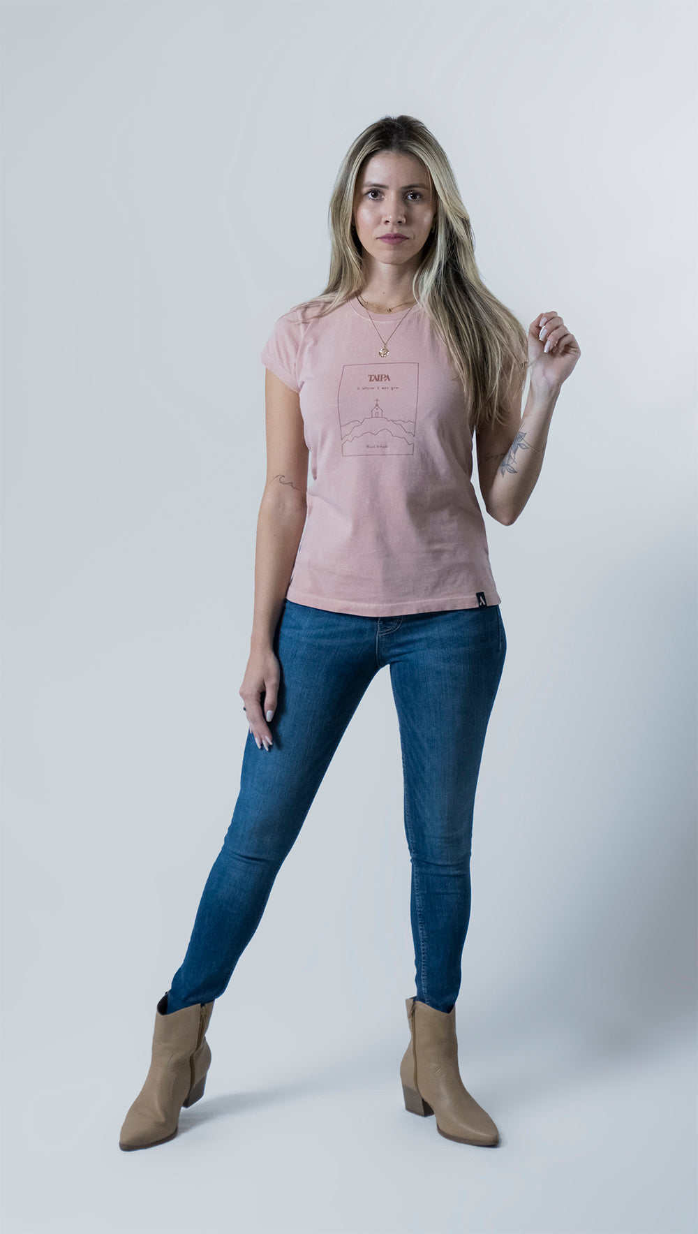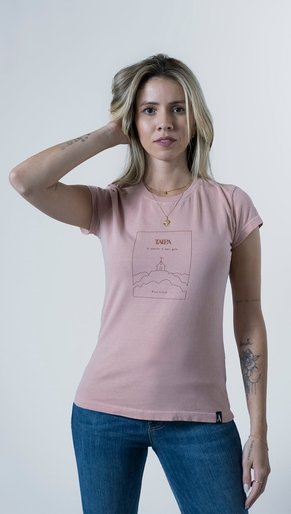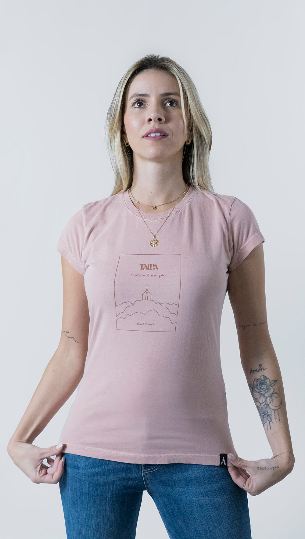 A Baby Look Meu Guia finda, portanto, como uma peça perfeita para todas as ocasiões. Permite inúmeras combinações de visual, do mais discreto ao mais ornado. Também se basta plenamente sozinha, em um visual mais delicado e básico. Levando consigo a crença no poder advindo do interior.