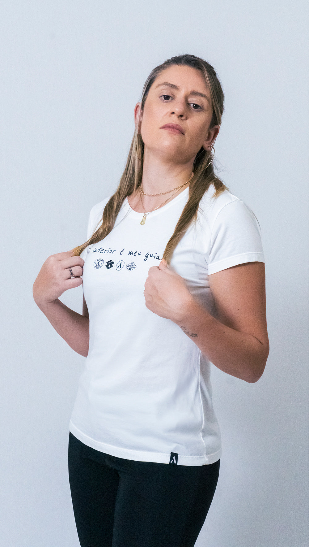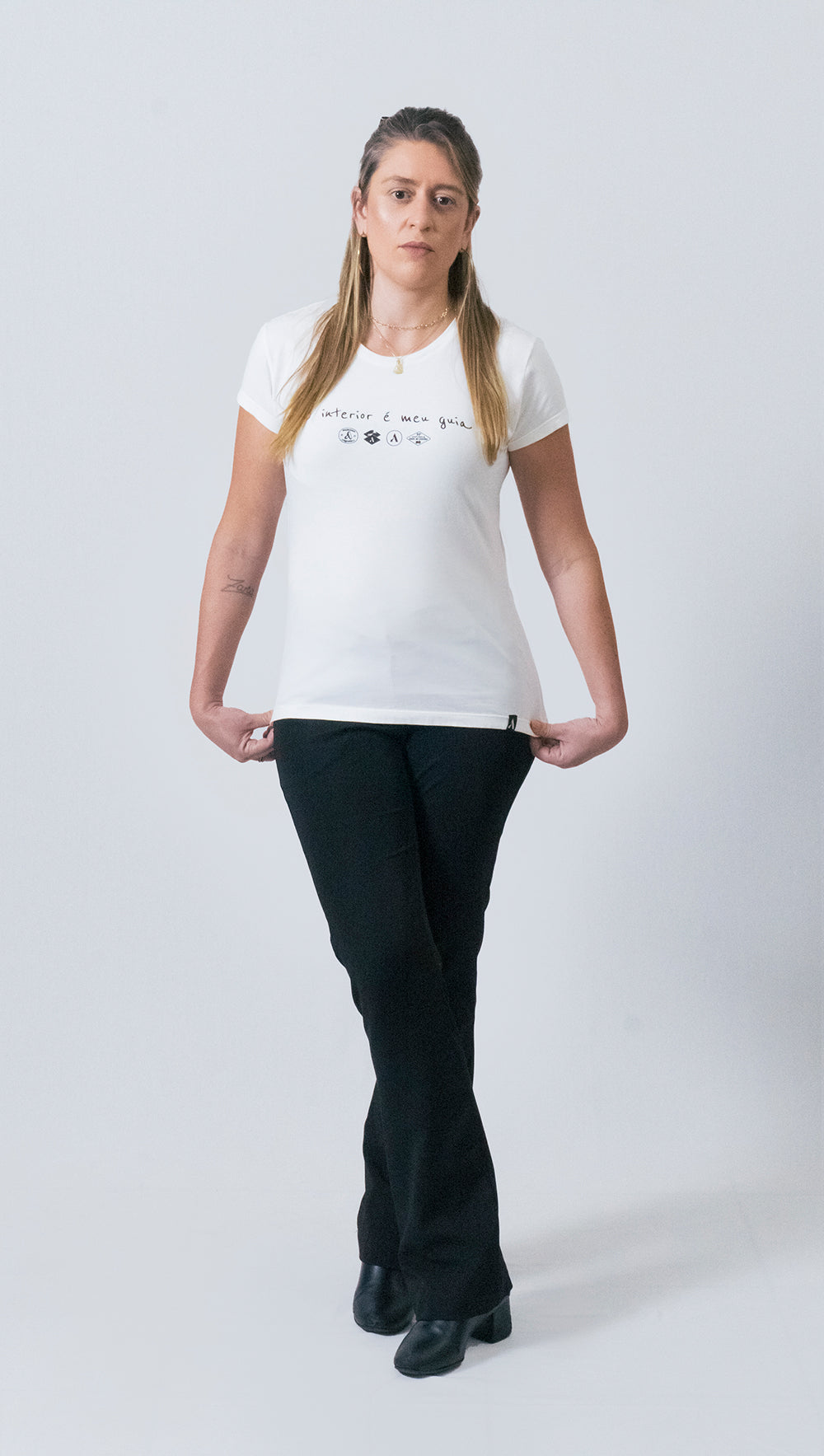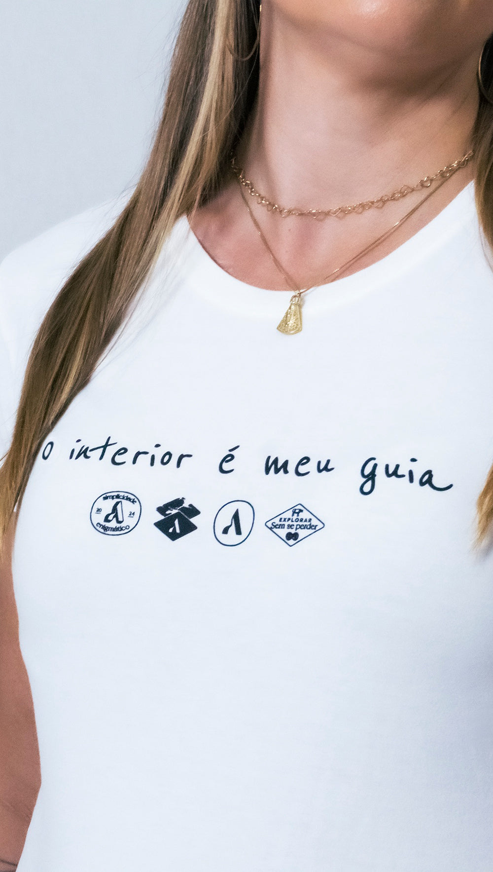 A expressão ‘‘O interior é meu guia’’ conquistou tantos admiradores por seu poder e simplicidade que a Taipa criou a Baby Look Meu Guia - Selos. Uma versão em Off White, discreta e com o belo conjunto de selos da Taipa para o público feminino que opta por cores mais básicas.