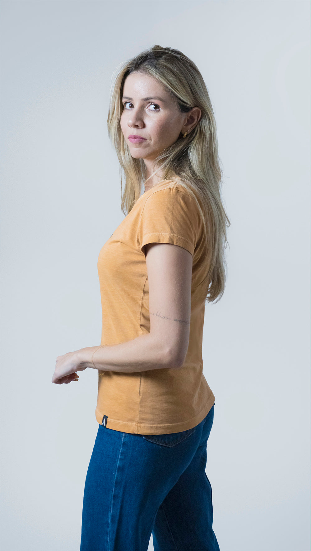 Sua matéria prima nobre, algodão 30.1 Penteado Premium e a costura na gola com reforço de ombro a ombro proporcionam a maciez no toque e a durabilidade prolongada. A lavagem Estonada, obedece às normas de respeito ao meio ambiente e, esteticamente, garante à peça um ar atemporal, belamente terroso. A modelagem é casual, com um caimento muito confortável, levemente ajustada ao corpo.