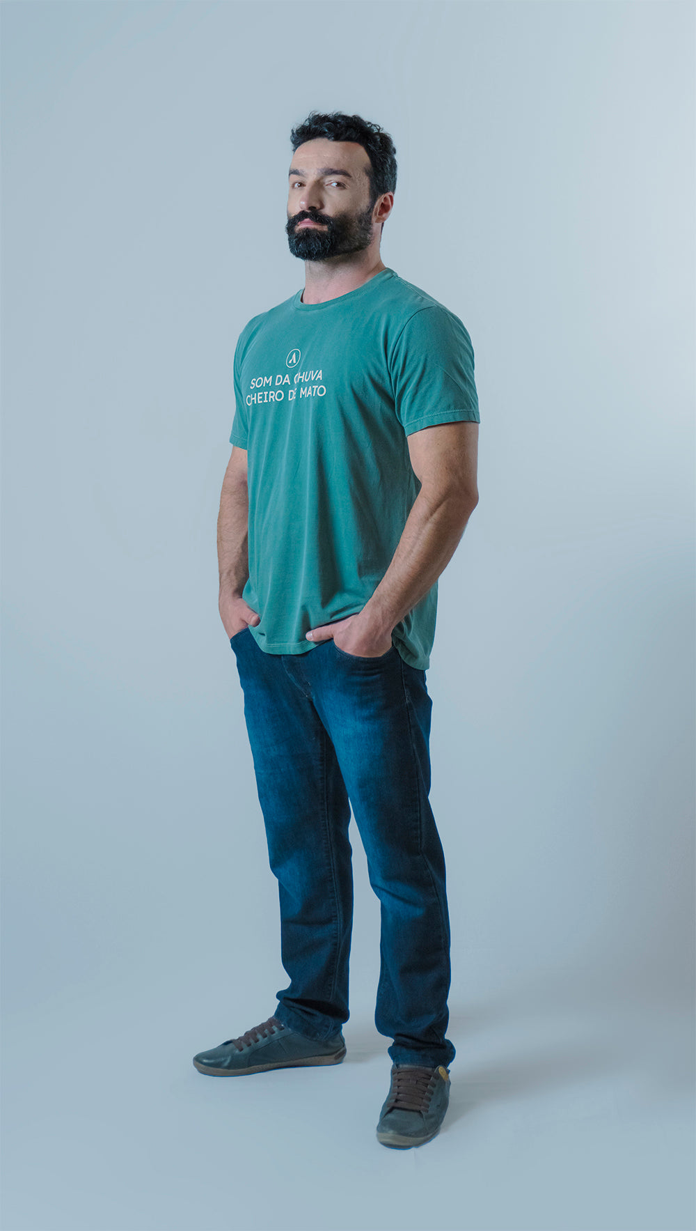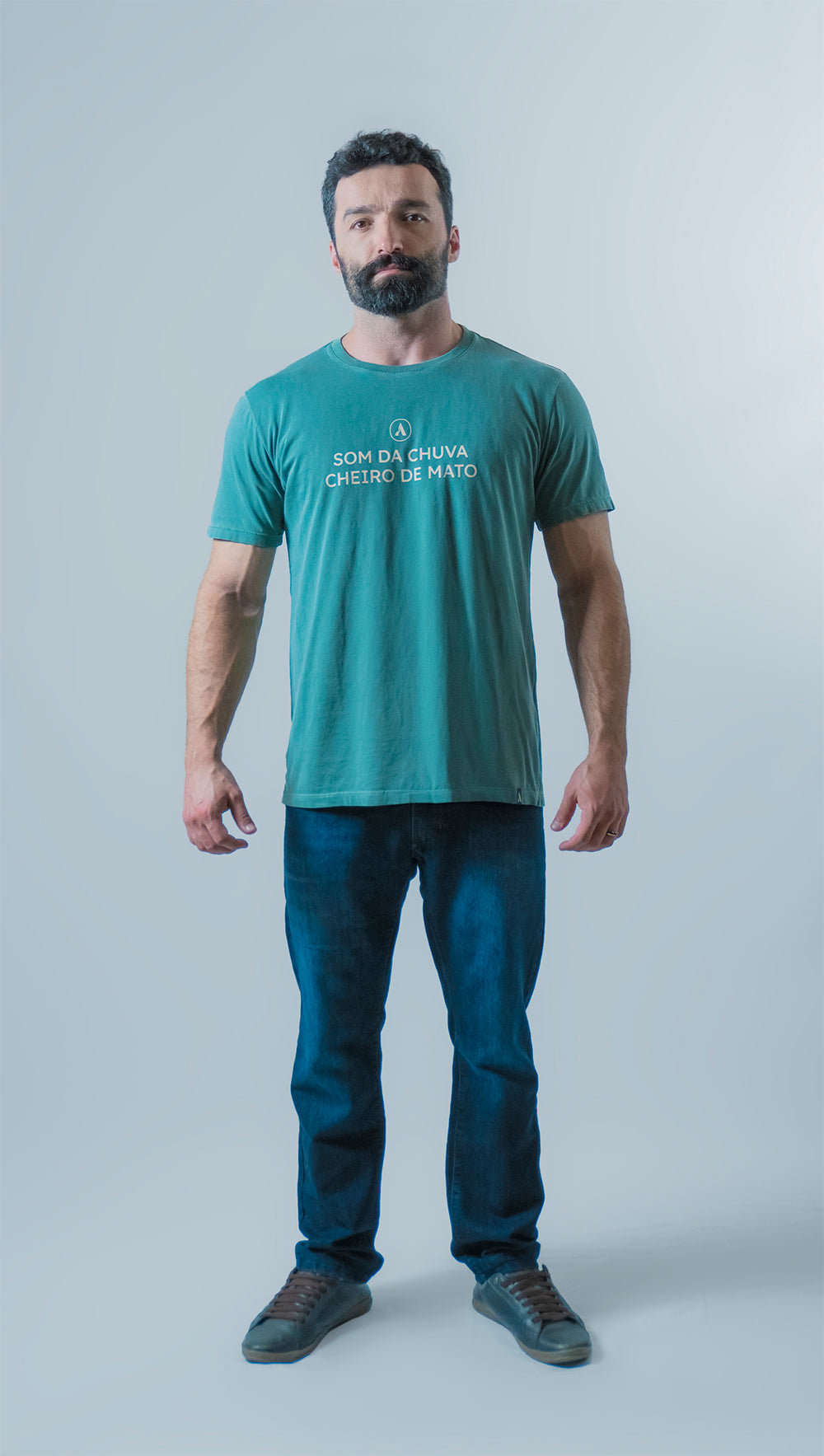 A Camiseta Som da Chuva é para uso casual, descontraída. Mas também permite uma variedade de combinações e visuais mais elaborados e especiais, graças a singeleza de seu dizer e a pompa de sua cor. Um elogio à poesia que habita as pequenas coisas.