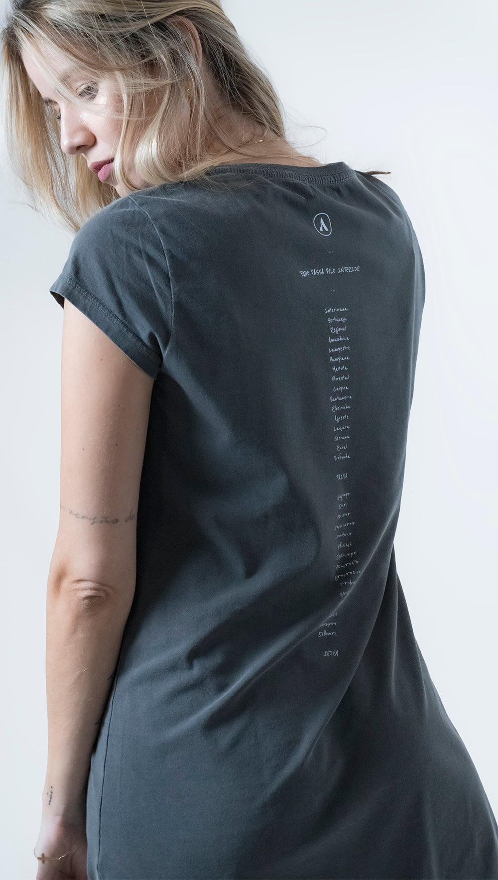 Sua matéria prima nobre, algodão 30.1 Penteado Premium e a costura na gola com reforço de ombro a ombro proporcionam a maciez no toque e a durabilidade prolongada. A lavagem Estonada, obedece às normas de respeito ao meio ambiente e, esteticamente, garante à peça um ar atemporal. A modelagem traz a ideia de uma T-Shirt alongada, com caimento confortável e aconchegante.